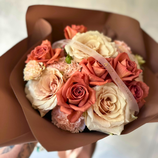 Bukiet z róż i goździków. Serce to zjawiskowe róże Barista i Quicksand – w odcieniach toffi, karmelu i śmietankowej kawy – tworzą zmysłową kompozycję, którą otuliliśmy w głęboki, czekoladowy papier. To kwiaty tak eleganckie i apetyczne, że aż chce się je… zjeść oczami.
