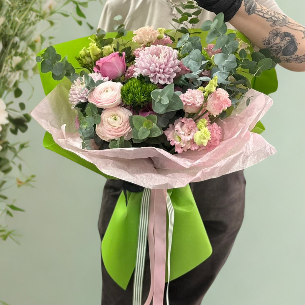 Wiosenny bukiet stworzony tak, by w każdym calu przypominał wiosnę. Różowe kwiaty (jak róże, gerbery, eustomy czy jaskry hanoi) zdobione szlachetną i pełną zielenią eukaliptusa cinerea). Wykończenie nie mogło być inne – zielony papier (lub pianka) i różowa bibuła.