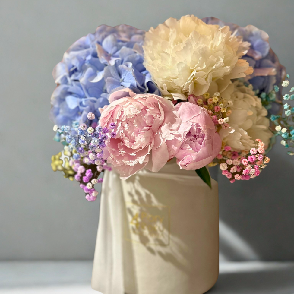 Welurowy Flower Box Piwonie i Hortensja z Kolorową Gipsówką – eksplozja kolorów