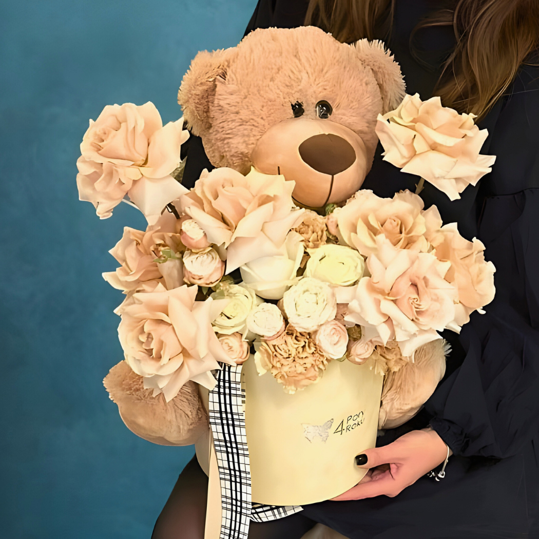 - Idealny prezent, który łączy elegancję beżowych kwiatów z urokiem pluszowego misia.