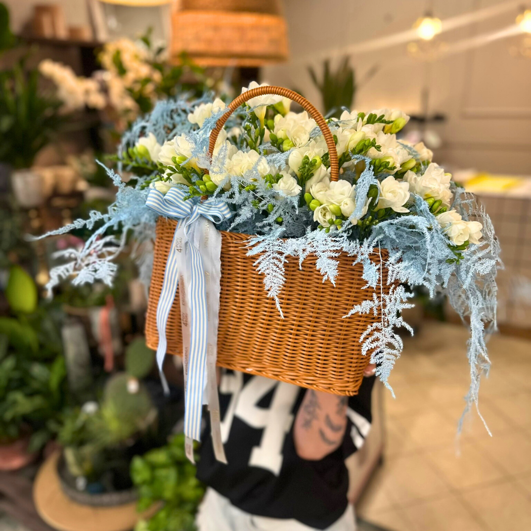 „Frezje w obłokach” – kosz kwiatów jak letnie niebo
