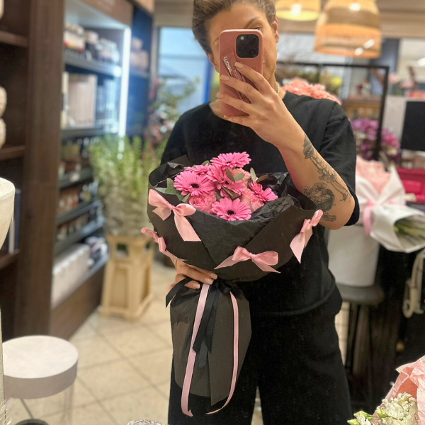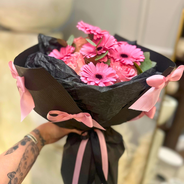 Różowe kwiaty w czarnym papierze z różowymi kokardkami