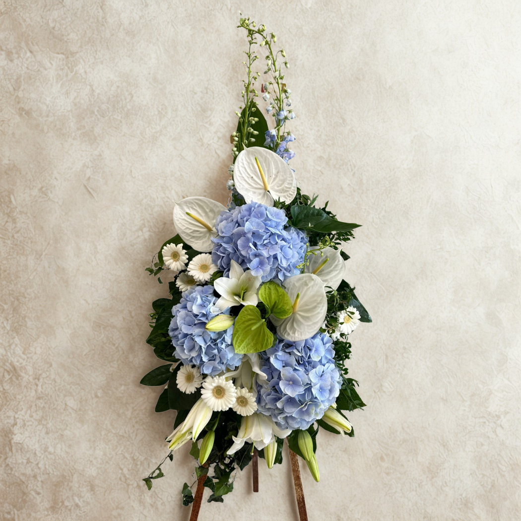 Subtelna elegancja: Nasze wieńce w kształcie łzy są kompozycją delikatnych, ale wyrazistych kwiatów, takich jak lilie, gerbery, anturium czy hortensje. Każdy wieniec emanuje elegancją, a jego wyjątkowy kształt dodaje kompozycji szczególnego charakteru, idealnego na ceremonię pogrzebową.
